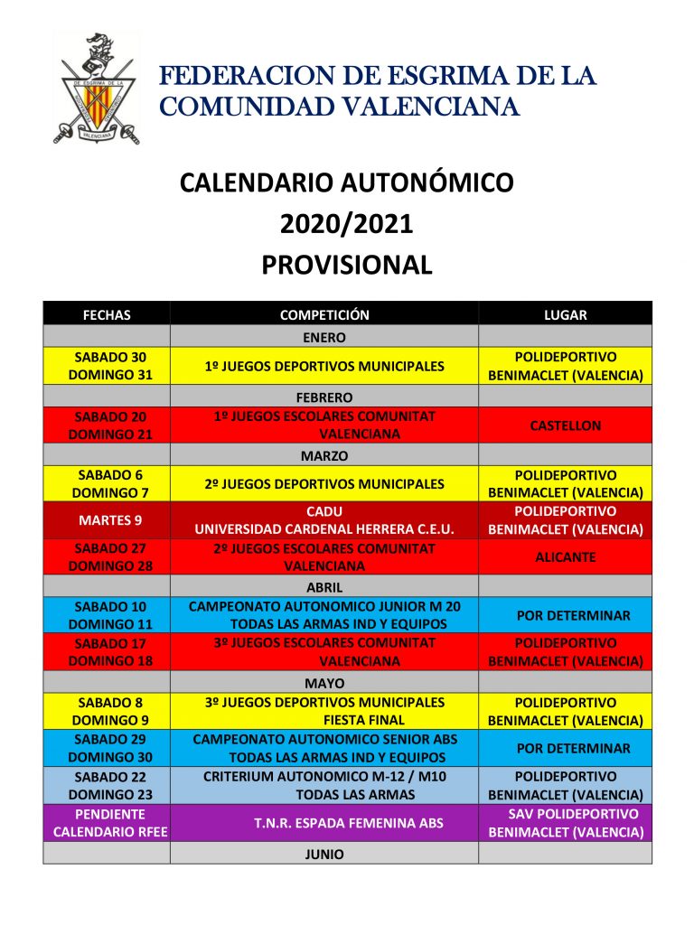 Como ya sabéis, nos tocan vivir tiempos complicados en lo sanitario. Por ese motivo, desde la Federación de Esgrima de la Comunidad Valenciana hemos aprobado un calendario de competiciones provisional.